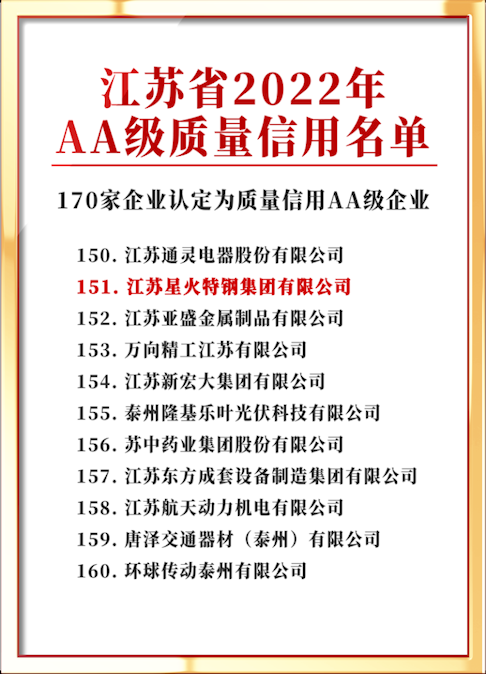 江蘇星火特鋼集團(tuán)有限公司獲2022年度江蘇省質(zhì)量信用AA級企業(yè)