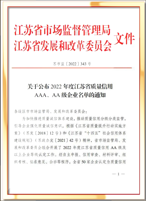 省市場監(jiān)管局、發(fā)展和改革委員會聯(lián)合開展了,2022年度江蘇省質(zhì)量信用AA級及以上企業(yè)等級認(rèn)定工作,50家企業(yè)認(rèn)定為質(zhì)量信用AAA級企業(yè),170家企業(yè)認(rèn)定為質(zhì)量信用AA級企業(yè)。